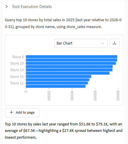 Turn natural-language questions into charts, KPI views, and reusable analytical outputs.