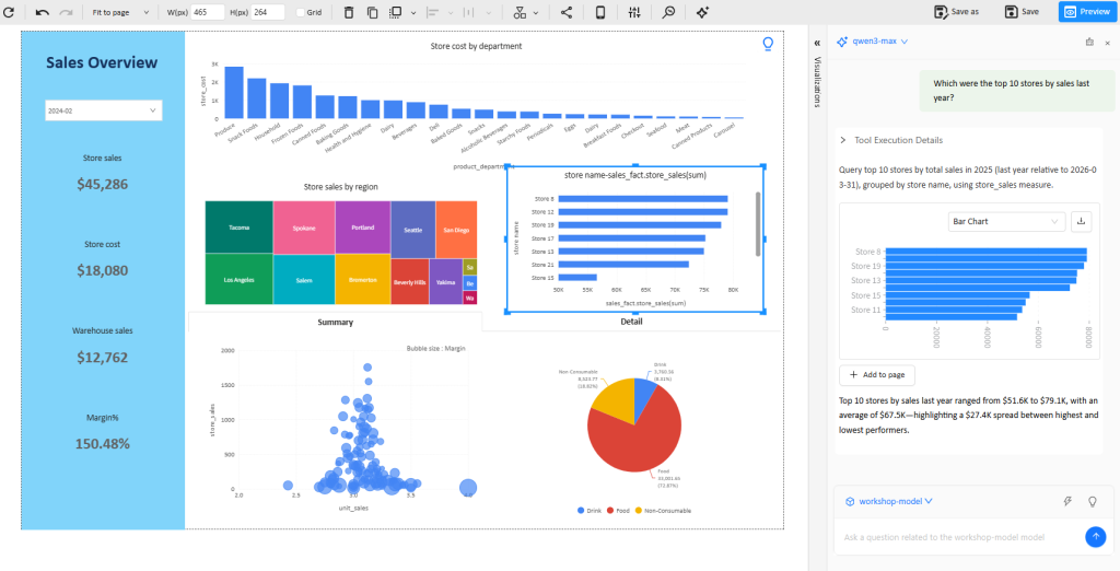 AI helps users start faster while the workflow stays structured, visual, and usable. The result is not just an answer — it is a usable analytical artifact.