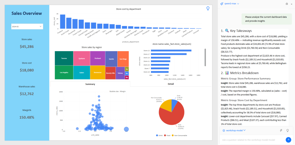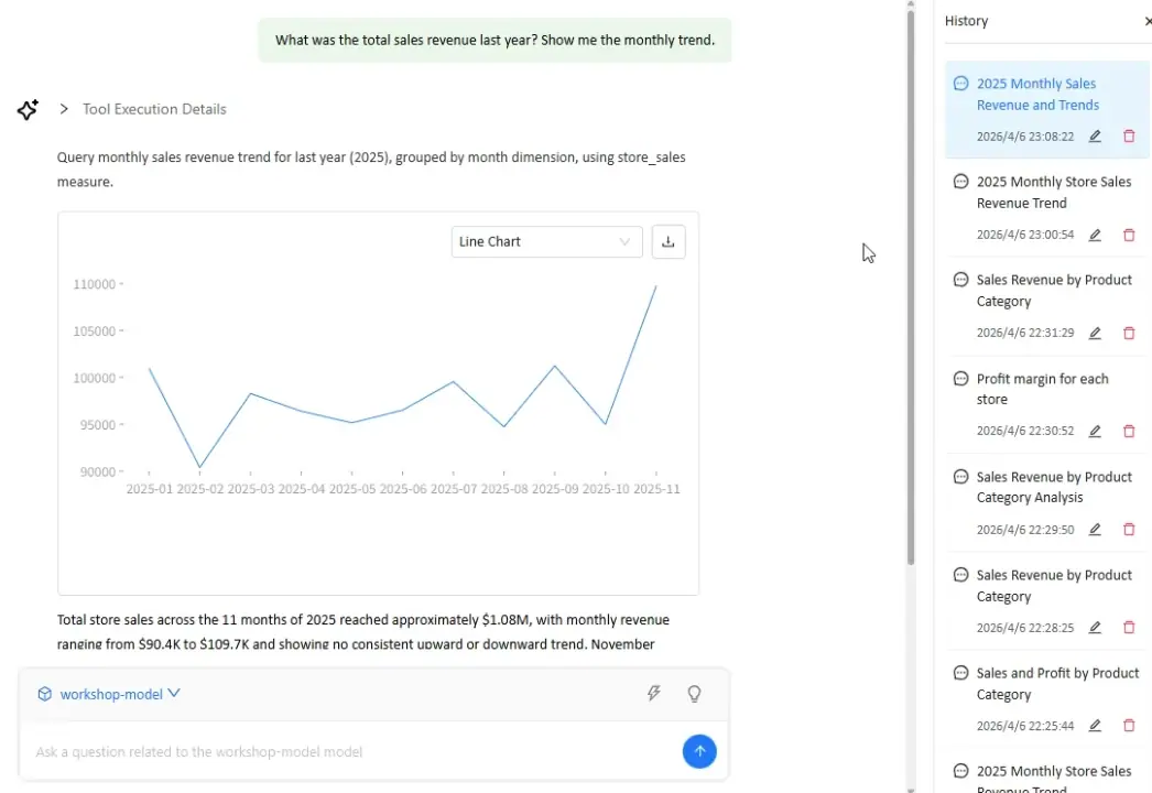 Natural-language requests become charts, metrics, and views users can keep working with — without breaking the structure of the analytics workflow.