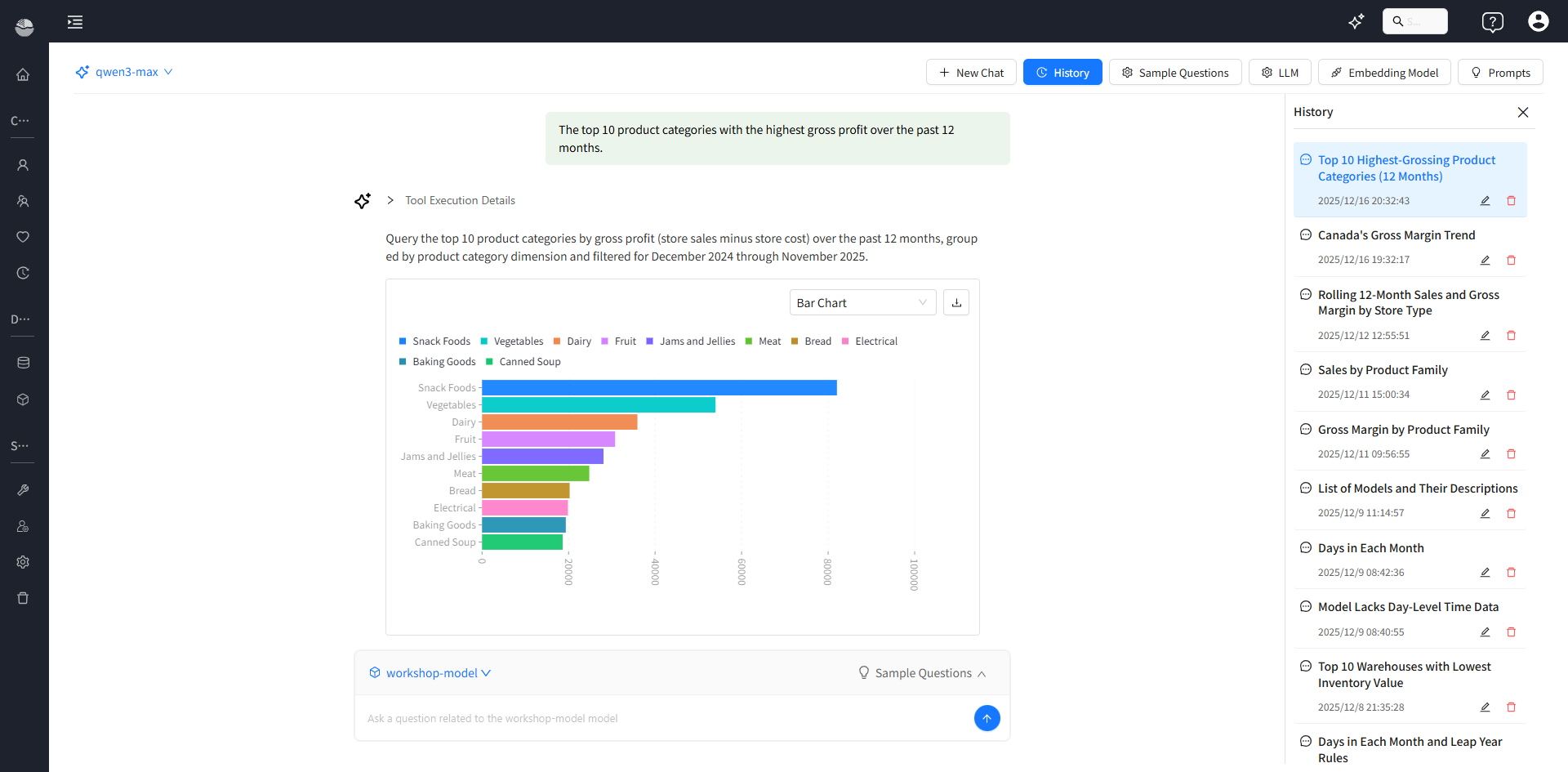 - Model metadata tool: fetch the “ground truth” semantic layer—available cubes, dimensions, levels, measures, calculated measures, etc.